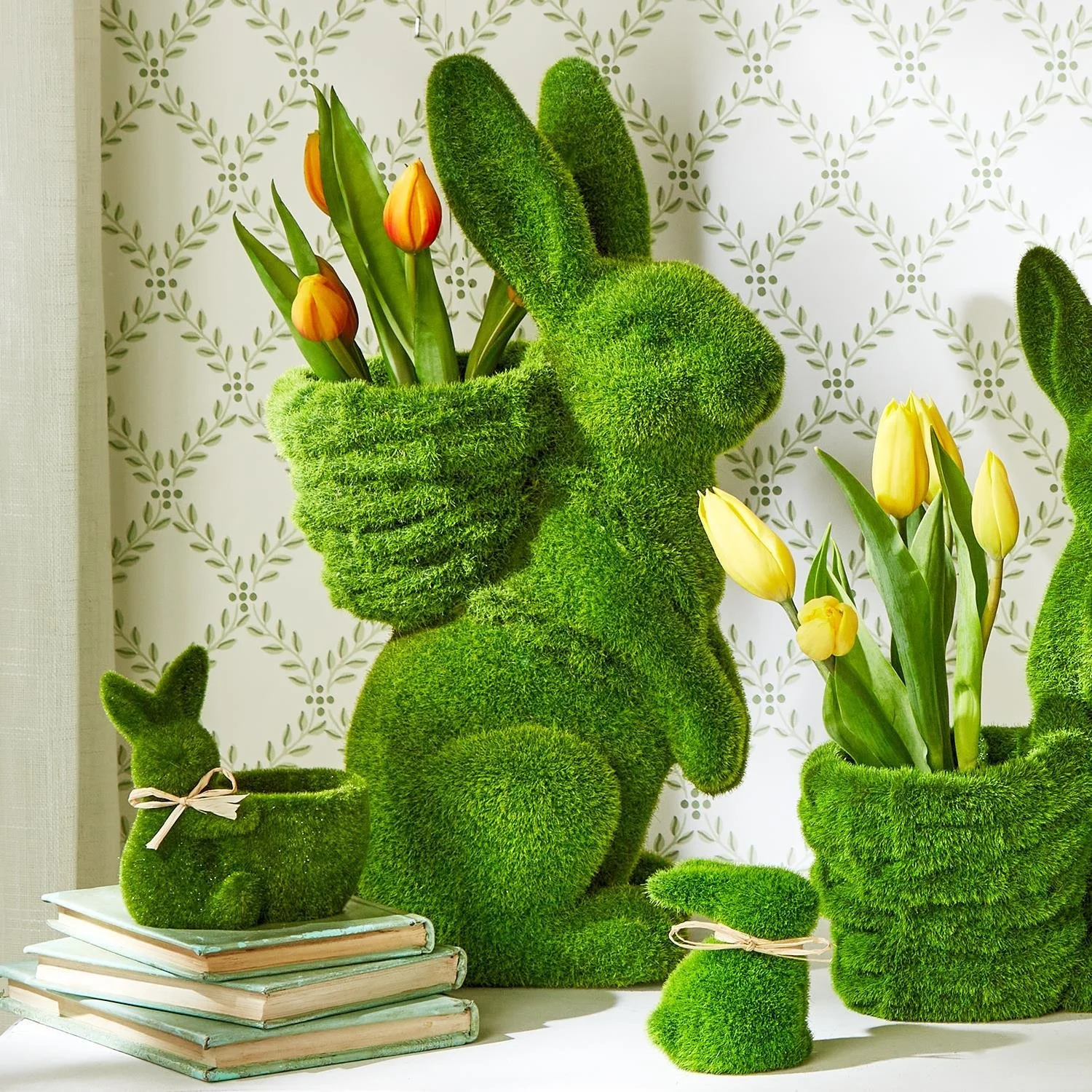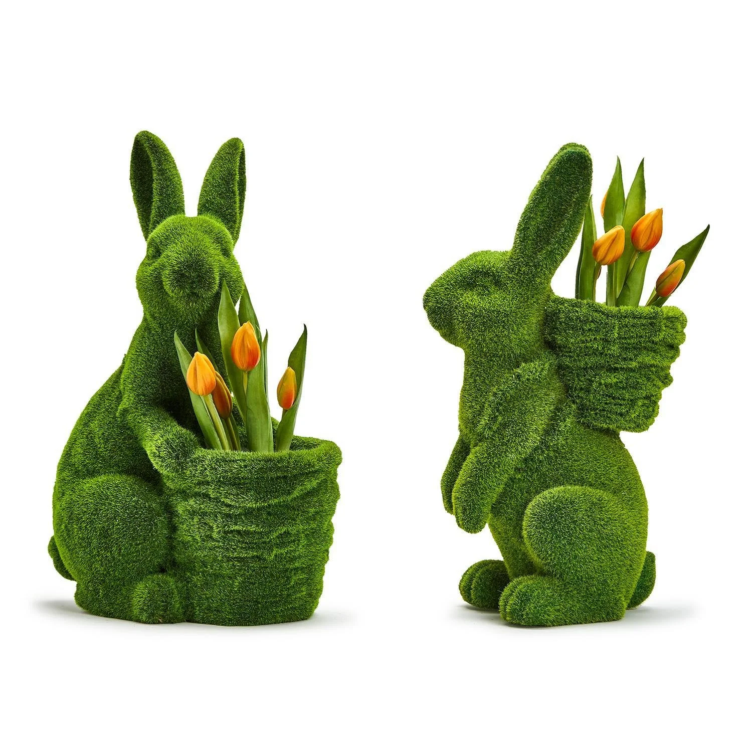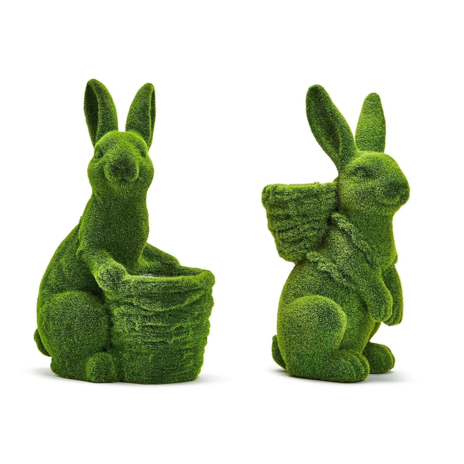 Hoppy Easter Set of 2 Faux Moss Easter Bunny with Basket Cachepot / Planter Includes 2 Designs - Magnesium Oxide These classic bunny planters are flocked with fresh green faux moss, making them the perfect addition to your home during spring! Fill the planter with fresh cut flowers, a potted plant, Easter eggs, or anything you wish. • 2 assorted designs • Crafted from stone powder and flocked faux moss • Fill with fresh flowers, potted plants, or Easter eggs • Water resistant; use of a liner recommended • For indoor use only •