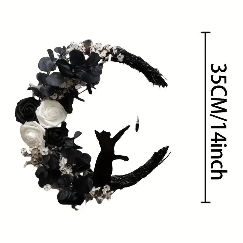 The Gothic Cat Moon Wreath adds a touch of mystery and festive charm to your home. Featuring a crescent moon design with a cat theme, this wreath blends classic style with holiday appeal, making it ideal for both Halloween and Christmas. Crafted from durable plastic and easy to mount on doors, it offers long-lasting seasonal use.