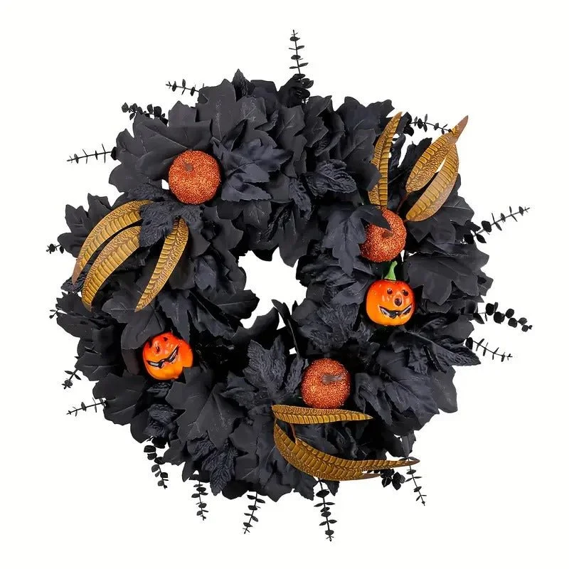 The Halloween Black Pumpkin Maple Leaf Door Wreath is designed to enhance your seasonal celebrations with versatile decoration. Perfect for Halloween, Thanksgiving, or Christmas, it brings festive charm to your home. Its sturdy build ensures it can be reused year after year, making it a practical choice for holiday decorating.