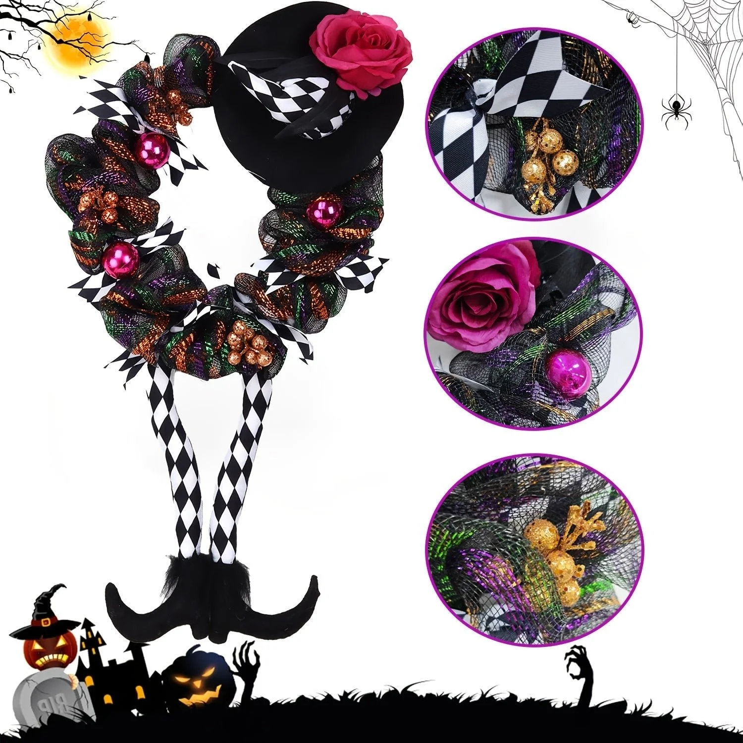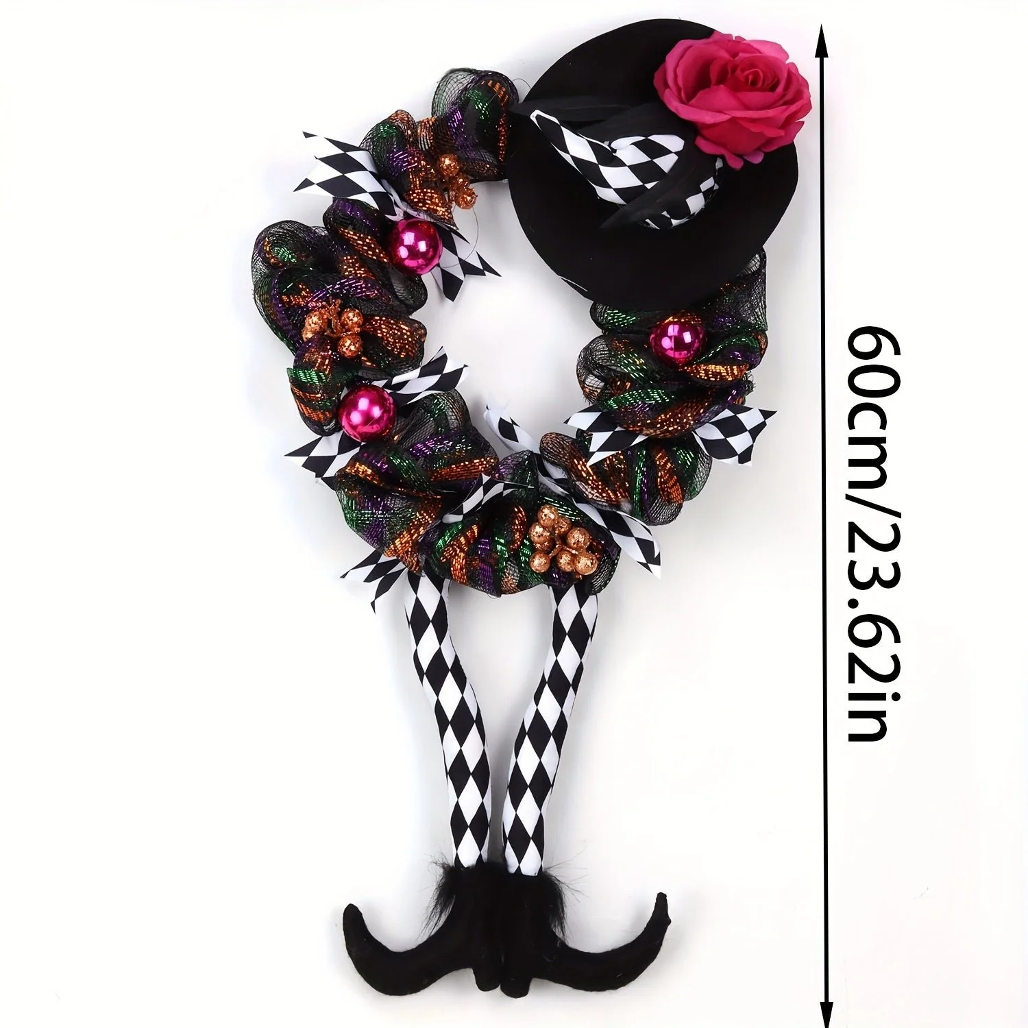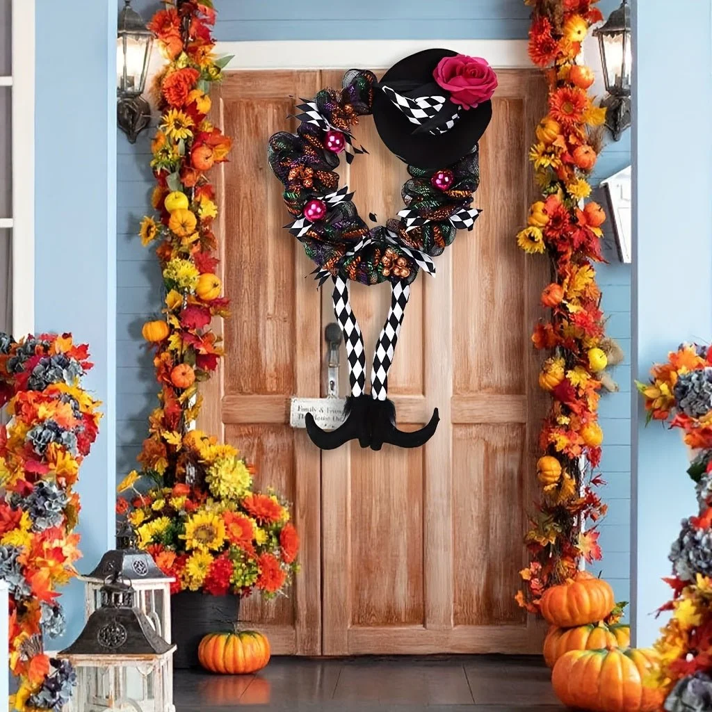 The Halloween Witch Wreath with Hat and Legs brings a playful touch of Halloween magic to your home. Designed in a vintage style, it features a witch-themed design perfect for decorating your front door, porch, or window. This 60 cm wreath is made from durable plastic, ensuring it stays in great shape throughout the season.