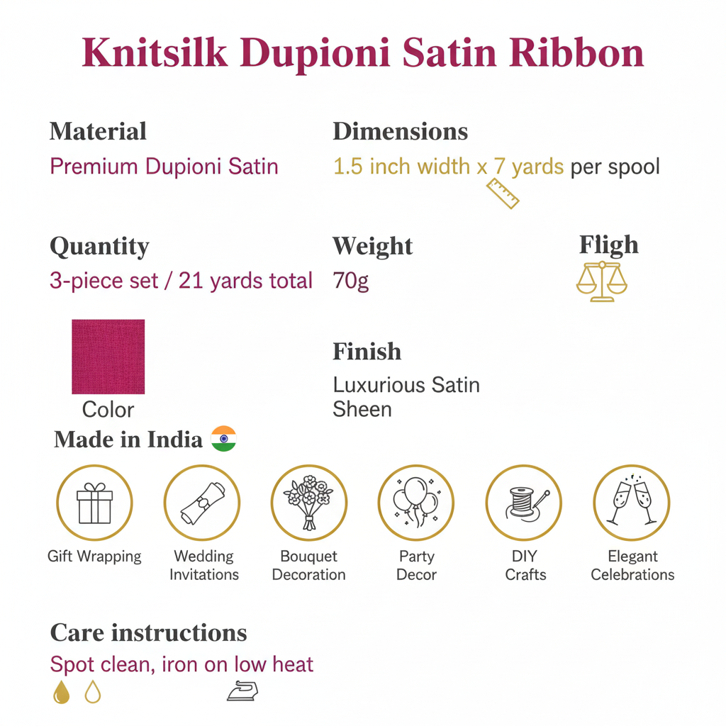 Elevate your crafting and gift-wrapping projects with the Knitsilk Luxurious Dupioni Satin Ribbon. This set includes three 1.5-inch wide ribbons, each measuring 7 yards in length, offering a total of 21 yards of premium quality satin ribbon. Perfect for gift wrapping, bouquet decorations, wedding invitations, and various crafts, this ribbon adds a touch of elegance and sophistication to any project. Its luxurious texture and vibrant colors make it a versatile choice for all your creative endeavors